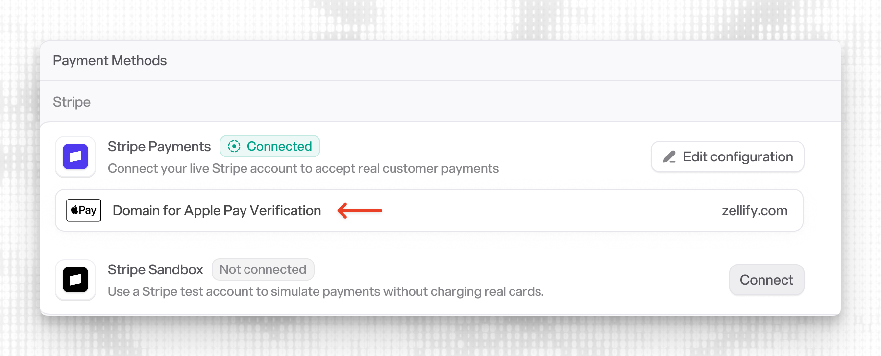 After connecting Stripe, you can register your domain to enable Apple Pay and Google Pay.